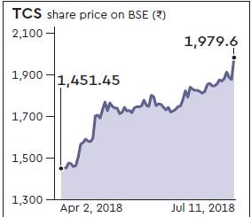 Shares of Tata Consultancy Services (TCS) soared 6.3% in intra-day trades hitting a record high on Wednesday after the software major reported better than expected results on Tuesday. The stock ended Wednesday’s session at Rs 1979.60, which was 5.5% above its previous close. TCS is India’s most valued company; its market capitalisation rose by Rs 39,281 crore on Wednesday to hit Rs 7.57 lakh crore. Reliance Industries Limited is valued at Rs 6.56 lakh crore while HDFC Bank commands a market value of Rs 5.58 lakh crore. The stock is now trading at a one-year forward price-earnings multiple of 24 times compared with a multiple of 18.1 times for Infosys. The TCS stock has risen a remarkable 46.6% since the beginning of 2018 against a rise of 28% for Infosys and the Sensex’s gain of 6.5%.