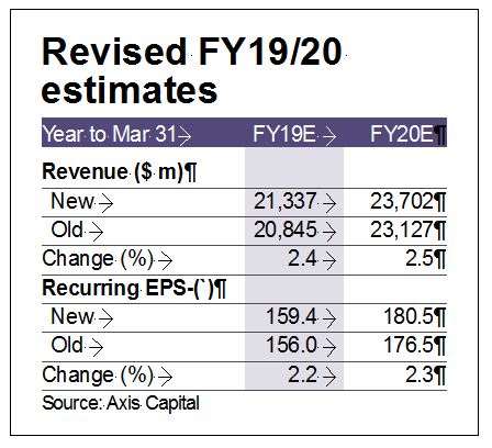 We revise our USD revenue estimate for FY19/20e by 2.4/2.5%, while retaining margin expectation in line with the management’s guidance. Our FY19/20e EPS estimate stand revised up by 2.2/2.3%. We have assumed INR/USD rate of Rs 66.3 for FY19/20e.