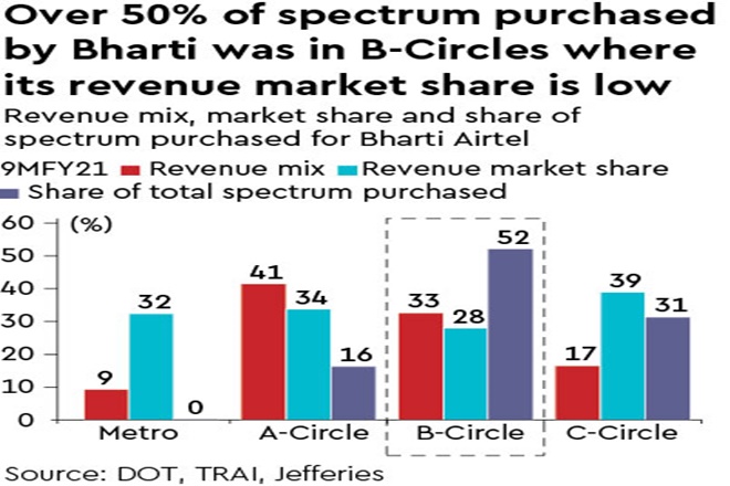 Reliance Jio acquired 697MHz of spectrum (on unpaired basis) for Rs 571 bn. Since this was disproportionately higher than Bharti and Vodafone Idea, Reliance Jio’s spectrum market share has increased from 20% to 25%. While its focus on renewals and boosting 1800MHz spectrum was in line with expectations, further acquisition of 2300MHz to take its holding to 40MHz pan India came as a surprise.