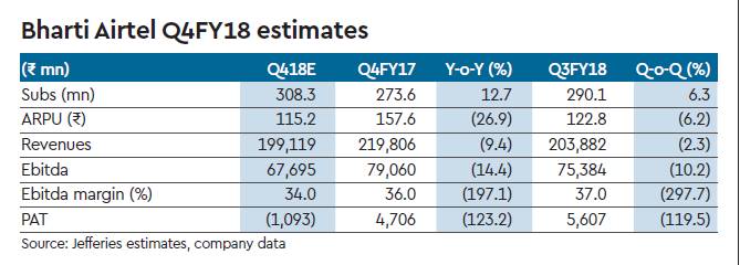 Bharti (Unpf): Sharp margin fall — We expect Bharti revenues to fall 2% q-o-q. We expect margins to moderate 300bps q-o-q led by decline across business. We would watch for commentary on market share and pricing outlook.