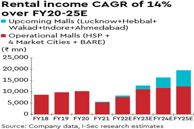 Estimated rental income CAGR of 14% over FY20-25e: PHNX will have ~13msf operational mall space by FY26e (6.9msf currently operational). We expect PHNX to achieve a 14% rental income CAGR (ex-new Kolkata asset) over FY20-25e resulting in Rs 19.5 bn of rental income in FY25e vs. ~Rs 10 bn in FY20. Of this, PHNX share is ~70% or Rs 13.8 bn.