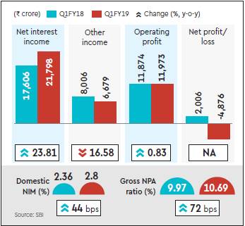Operationally, the lender fared satisfactorily with domestic advances registering a growth of 7.2% year-on-year of which retail advances increased a good 14.11%. Net interest income was up 23% year-on-year to Rs 21,798 crore. Domestic net interest margin rose 28 basis points sequentially to 2.95%. Provisions and contingencies surged 115.33% to Rs 19,228.26 crore in Q1FY19 from Rs 8,929.48 crore a year ago. However, on a quarter-on-quarter basis, they declined 31.56% from Rs 28,096.07 crore.