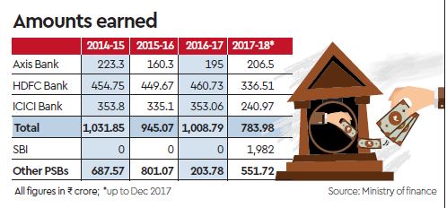 The three largest private banks — HDFC Bank, ICICI Bank and Axis Bank — earned more than all 21 of their state-owned peers put together from penalties levied for non-maintenance of minimum balance in savings accounts between FY15 and FY17. According to data put out by the ministry of finance in response to a Rajya Sabha question, the scales tipped only in FY18, when State Bank of India (SBI) imposed a levy on non-maintenance of minimum balance. The three private lenders together collected Rs 1,031.85 crore in FY15, Rs 945.07 crore in FY16, Rs 1,008.79 crore in FY17 and Rs 783.98 crore in the nine months ended December 2017 as penalties for shortfall in account balances. For public-sector banks (PSBs), the figures were Rs 687.57 crore, Rs 801.07 crore, Rs 203.78 crore and Rs 2,533.72 crore, respectively. SBI alone collected Rs 1,982 crore between April 2017 and December 2017.