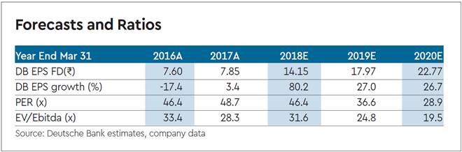 We increase our FY17-19 EPS estimates by 17% and our target price (TP) to Rs 900 (vs. Rs 625) factoring in the 2Q beat. The increase in our TP is higher than our earnings upgrade as we ascribe a 10% premium over its last five-year average P/E of 40x (we value Titan stock at 44x Sep-19E) and roll-over. We forecast earnings to double over FY17-19. Titan and Jubilant (Buy, Rs 1,611; target price Rs 1,775) are our top picks in Consumer Discretionary.
