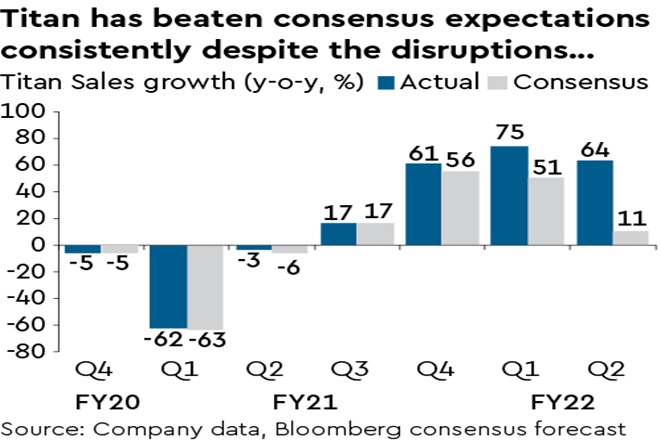 Titan delivered exceptional sales for Q2: (i) Jewellery rose by 78% y-o-y on strong pent-up demand as the network rollout picked up pace with 13 new Tanishq stores (net) added. (ii) Watches were up 73% y-o-y on recovery in walk-ins with Tier-2 cities doing better than metros. (iii) Eyewear was up 74% y-o-y with healthy growth across all segments. (iv) Taneira recorded total store operation days of 80% with all 14 stores operational. (v) CaratLane’s sales rose 95% y-o-y with two new stores. And (vi) Titan’s standalone sales were up 64% y-o-y overall, beating consensus by a wide margin.