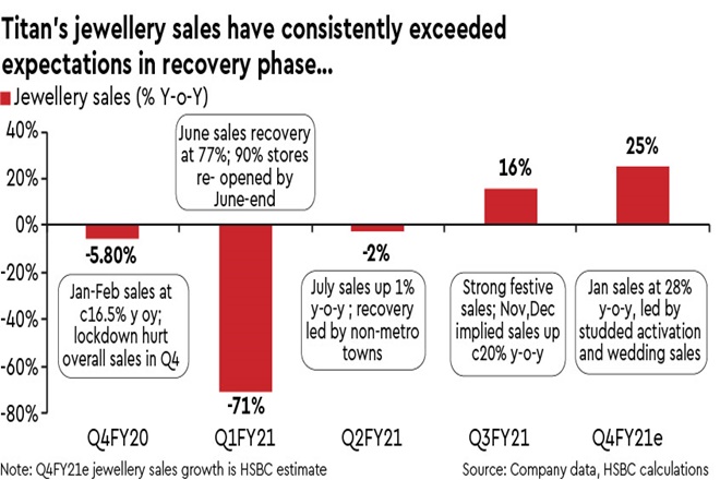 Despite market expectations that the company would be one of the most disrupted in the crisis, Titan has managed to surprise in every quarter with its pace of recovery, especially for its Jewellery business (nearly 80% of revenue and 90% of profits), which is a key value driver. The stock price has also mirrored this outperformance, nearly doubling from the low in March 2020. While the stock has corrected from its recent peak, we retain Buy rating on Titan.