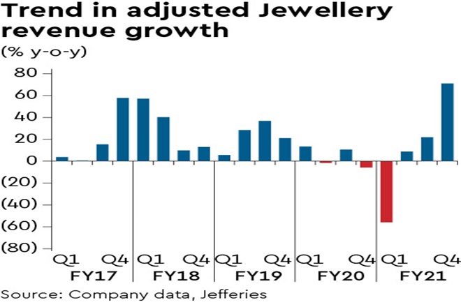 Good jewellery: Reported jewellery revenues grew 70% y-o-y– the strong growth was led by a low base in March, underlying 32% retail growth in Jan/Feb and 10% growth contribution from a B2B order. Correction in gold prices also helped as grammage grew 45% y-o-y.