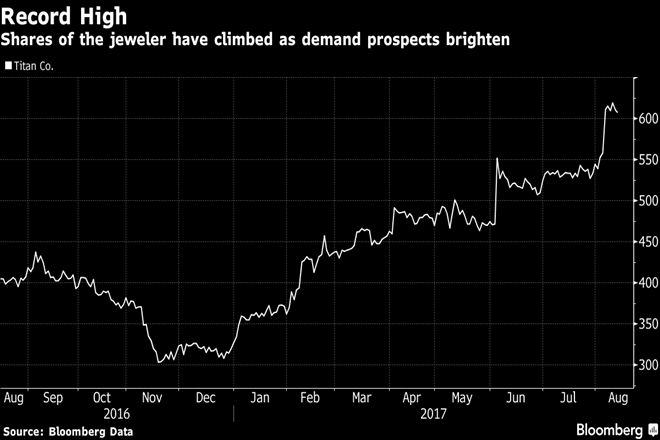 Titan has become the top pick among Indian jewelers after the government implemented the uniform goods and services tax last month, as well as introducing additional measures to increase financial accountability and clamp down on so-called black money. The stock has surged 94 percent this year to a record, valuing the company at about 563 billion rupees ($8.8 billion). Asia’s third-largest economy vies with China as the world’s largest gold consumer.