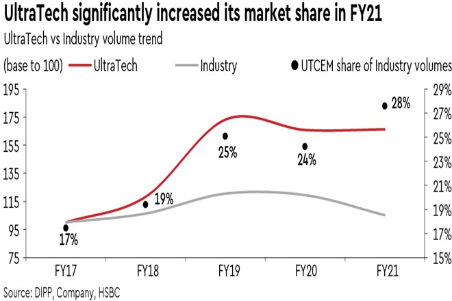Look beyond the near term: The new COVID-19 wave in India remains a key risk in the near term. Our interactions with dealers suggest moderation in sales. However, cement demand, in our view, is often sticky and should see a quick recovery as the macro environment and impact of the pandemic normalise over the year. We continue to factor in 10% grey volume CAGR over FY21-24e for UTCEM.