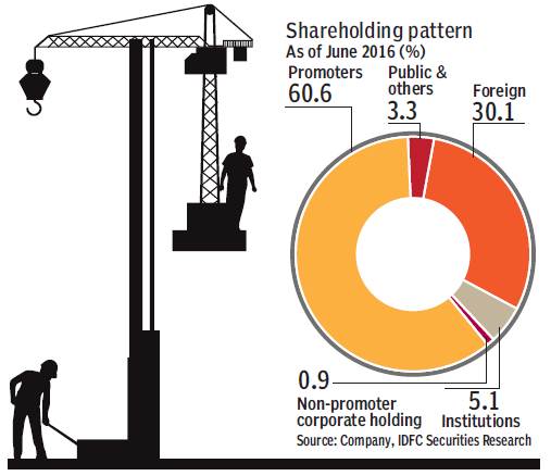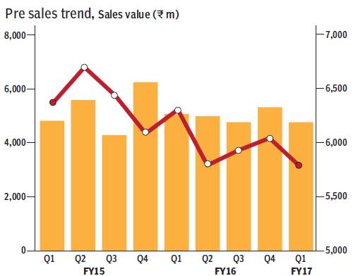 Other highlights: During the quarter, Sobha sold 0.81 msf with a sales value of Rs 4.7 bn. Average realisation fell by 3% y-o-y led by change in product mix. Sobha’s run-rate has been stuck in a narrow band of 0.8-9 msf over the last several quarters now. Company’s FY17 guidance of 3.5 msf/Rs 20 bn is also largely in line with this run-rate which is indicative of management’s caution and doesn’t give too much comfort on a material turnaround in the company’s growth trajectory anytime soon.