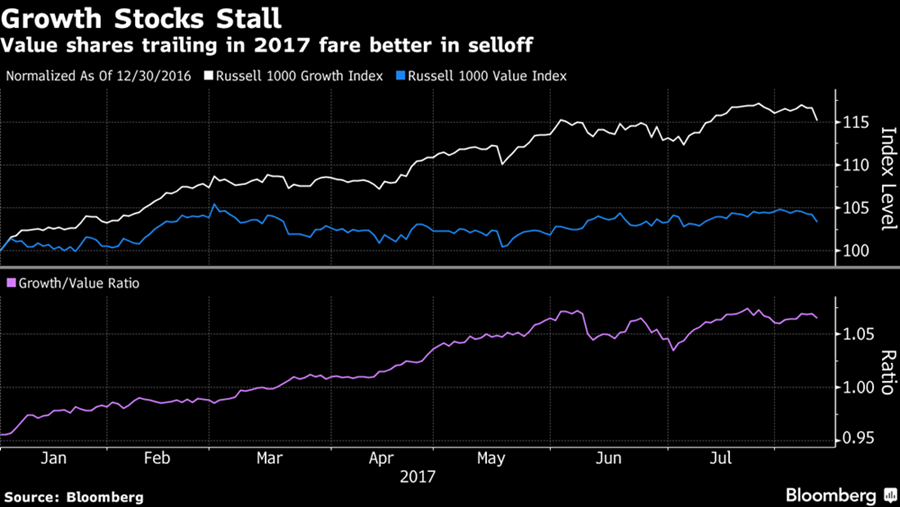 Since the post-election “Trump-reflation trade” hit a wall at the start of the year, there’s been one trade that investors in the equity market could count on: buying shares of companies with the best outlook for earnings growth. Stocks in the Russell 2000 growth index rallied 15 percent this year before Thursday. Relative to a 3.5 percent gain in value stocks, it’s the biggest advance for those shares over any eight-month stretch since 2009, according to data compiled by Bloomberg.