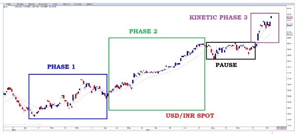 Price action remains decisively bullish in USDINR. There has been an interesting shift in the way price behaved. What was initially a shallow up move during the first phase, turned into a high momentum uptrend during phase two. Ahead of the current phase of rapid uptrend, there was a multi-month consolidation. The changing face of momentum shows that USDINR could be entering a phase of very high volatility and RBI may be forced to intervene aggressively. We expect an overall range of 81.70 and 83.00 over the near term, with an upward bias.