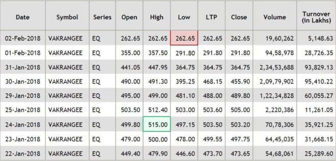 A heavy trading volume has been observed in the shares of Vakrangee from 29 January to 1 February 2018. Today only, more than 42.6 crore shares exchanged hands on both NSE and BSE with about 42.3 crore shares on NSE alone. The stock of Vakrangee shed 10% to a day’s low of Rs 236.8 on BSE on Monday.