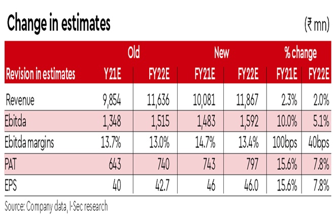 Valuation and outlook: Considering the better than expected performance in a seasonally weak quarter (Q2FY21), we increase our revenue/PAT estimates by 2.3%/2.0% and 15.6%/7.8% for FY21e/ FY22e. We now expect VSKI to report overall revenue and PAT CAGRs of 6.3% and 27.2%. Higher profitability and stricter working capital discipline leading to sizeable paring of debt would aid the company in improving its RoCEs to ~15%. Maintain Buy with a revised TP of Rs 552 (earlier: Rs 512), at 12x FY22e earnings.