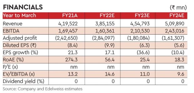 Awaiting capital-raise and tariff hike: We believe VI has a very small window to raise capital and prepare itself for 5G considering spectrum auctions are scheduled for H2FY23. Considering VI has been lagging its peers in terms of network investments, timely capital-raise and network investment will be crucial for long-term sustainability of the business. Besides, ARPU needs to double for VI over the next 3-4 years for it to meet its current debt obligations.
