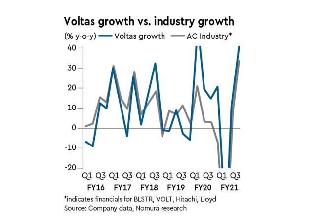 VOLT’s Q3FY21 revenue/Ebitda at Rs 20/1.5 bn came in significantly ahead of our forecasts (Rs 17/1.1 bn) and Bloomberg consensus (Rs 16.6/1.1 bn). AC business was strong with revenue growth/Ebit margin at 40% y-y/12.5%, well ahead of peers. VOLT’s share remained stable at 26% in 9MFY21 (24.2% in FY20) while it achieved leadership in inverter ACs with 21.8% share in Dec 2020. The project business reported 26% y-y revenue growth (Ebit margin 3.2%) and order book increased further to Rs 72.5 bn.
