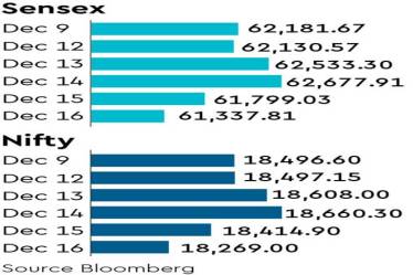 “Domestic equities slipped into negative territory following the US Fed’s hawkish commentary and weakness in global markets. The markets seems to have taken a pause after reaching new highs, with the Nifty down 3% in the last few sessions. They are likely to remain in the consolidation range owing to lack of triggers in the near term. Lower participation from institutional investors due to upcoming year-end holidays will also keep markets lacklustre. However, investors will keep one eye on the US Home Sales and GDP (QoQ) numbers, to be released next week. Selling might be seen in banking stocks on account of profit-booking,” said Siddhartha Khemka, head (retail research), Motilal Oswal Financial Services.