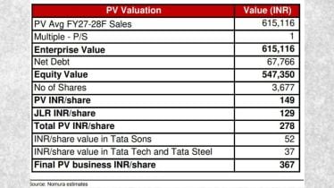 The Tata Motors share price has been in focus as the valuations got adjusted after the record date for the demerger. As the Commercial Vehicle (CV) and Passenger Vehicle businesses begin their independent stock market journey, the question is, what is the right value for the stock? The fair value post-demerger is a crucial number to follow. Nomura’s target price is split almost evenly between the two entities at Rs 365/share for the CV entity and Rs 367/share for the PV entity.