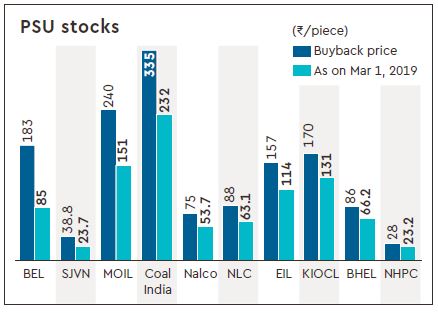 Defence PSU Bharat Electronics (BEL) saw its share value lose a massive 54% (as on March 1, 2019) compared with the buyback price of Rs 183 on March 15, 2018. SJVN, which bought back shares at a price of Rs 38.8 on January 19, 2018, saw its shares lose 39% from that level, as on March 1, 2019.