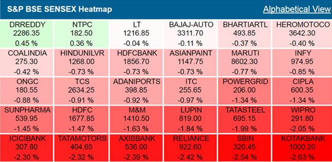 With all the above factors weighing on the stock markets, in order to book partial profits ahead of uncertainty over GDP data, a heavy selloff pattern was noticed in the blue-chip stocks. Since today morning, markets witnessed heavy selling, later it got spiked after the government’s budget value was announced. The stocks of heavyweight companies ended lower on Sensex today are Kotak Mahindra Bank (down 2.63%), State Bank of India (down 2.54%), Reliance Industries (down 2.42%), Axis Bank (down 2.39%), Tata Motors (down 2.32%), ICICI Bank (down 2.3%), Wipro (down 2.05%), Tata Steel (down 1.99%), HDFC (down 1.47%), ITC (down 0.97%), TCS (down 0.91%), Infosys (down 0.85%), Maruti Suzuki (down 0.77%) while HDFC Bank and Hindustan Unilever dropped 0.73% each. The stocks of Reliance Industries, ICICI Bank, HDFC, Kotak Mahindra Bank, State Bank of India, HDFC Bank, Axis Bank, ITC, Tata Motors, Infosys and TCS. Collectively these 11 stocks alone washed off 360 points.