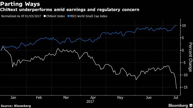 Big caps have been the winners in China this year, with the SSE 50 Index of some of the nation’s biggest companies jumping 15 percent as investors bet on the security of state-owned enterprises. Offshore traded Chinese stocks have also been immune to gloom: the MSCI China Index has surged 30 percent this year, led by technology giants such as Alibaba Group Holding Ltd. and Tencent Holdings Ltd. That’s of little consolation to shareholders of companies on the ChiNext gauge, the home of mainland-listed technology firms, as the gauge trades at levels not seen since January 2015.