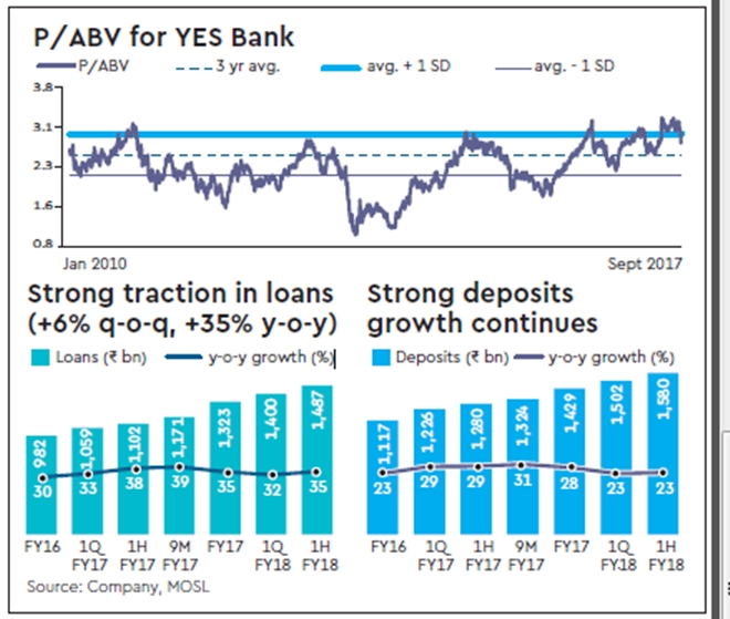 Asset quality deteriorated sharply, affected by the divergence of Rs 63.55 bn (19 accounts) — of which YES downgraded loans worth Rs 12.19 bn, sold three accounts worth Rs 4.61 bn to ARC and upgraded 12 accounts worth Rs 29.83 bn, and recovered Rs 16.9 bn. GNPL/NNPL thus increased 99/183% q-o-q, while the coverage ratio fell ~1,700bp to ~43%. Credit cost increased to 29bp (48bp in H1FY18); however, the bank has guided to maintain its FY18 credit cost at <70bp.