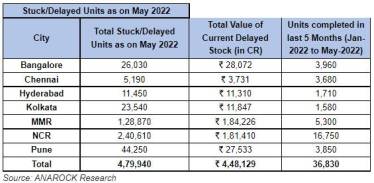 * Bengaluru saw over 3,960 units completed in the period. Currently, the city has approx. 26,030 stuck/delayed units worth over Rs 28,072 cr. In 2021-end, it had approx. 29,990 stuck/delayed units worth Rs 32,345 cr.