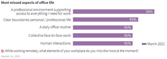The social interactions that an office space provides are being sorely missed, to the extent that 41% of the workforce is craving ‘real’ human interactions with colleagues while 31% of them miss a change of scenery. Amongst the most missed aspects of the weekly routine, coffee and socializing in social activities, personal time for relaxing and spending time with family stand out.