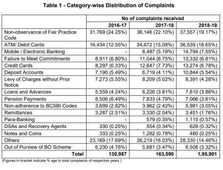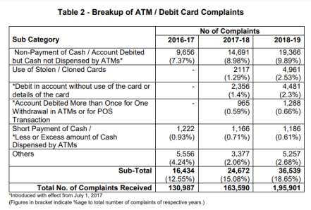 “Complaints relating to ATM / Debit Cards comprised 18.65% of total complaints, up from 15.08% in the previous year. Of the total number of ATM / Debit Cards complaints, a major sub-category was ‘Account debited but cash not dispensed by ATMs’ which accounted for almost 53.00% of the ATM-related complaints,” the central bank said in the report released today. The total number of such complaints were 19,366.
