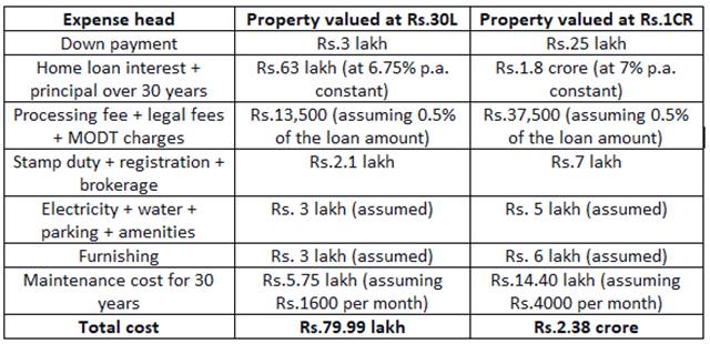 Let’s look at this table to find out the total cost of two ready-to-move-in properties (so, no GST), one priced at Rs 30 lakh and another at Rs 1 crore bought on a loan for 30 years without making any part-prepayments. Remember, these are just indicative figures and the actual costs may greatly vary depending on the type, size and location of the property.