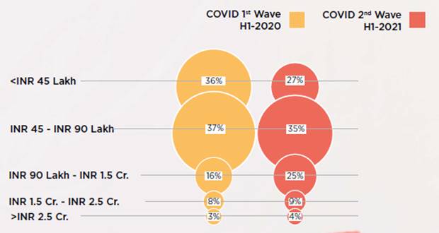 Demand for luxury properties (>Rs 1.5 cr) also increased – from 11% in the COVID 1st wave survey to 13% in the COVID 2nd wave survey results. Nearly 63% of this demand is from Mumbai-MMR, followed by Bengaluru and Hyderabad.