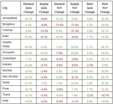 The report noted a substantial quarter-over-quarter increase of 14.8% in rental demand during this timeframe, succeeding a 16% quarter-over-quarter rise in the preceding quarter. Conversely, the supply has contracted by 2.2% quarter-over-quarter across the surveyed cities, attributed to elevated absorption rates, which has resulted in an increase in rental prices.
