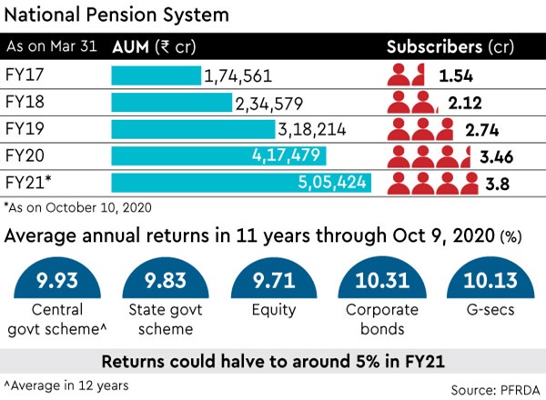 The AUM for NPS has recorded a sharp increase of 35% to Rs 5.05 lakh crore as on October 10, 2020 compared with Rs 3.74 lakh crore a year ago (the growth in AUM has been a handsome 21% since March 31, 2020, despite the pandemic and lockdown). Bandyopadhyay expects the AUM to rise further to Rs 6 lakh crore by end-FY21.