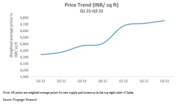 In Pune, prices rose 7 per cent to Rs 5,500-5,700 per square feet in July- September 2022 from Rs 5,100-5,300 per sq ft at the end of the 2021 calendar year.