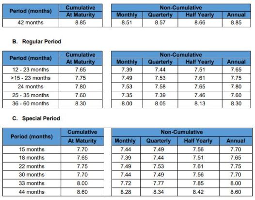 Effective January 2, 2024, Bajaj Finance is offering upto 8.85% per annum to senior citizens for a tenure of 42 months for FDs booked on the Bajaj Finserv App and web. Depositors below 60 years can earn up to 8.60 per cent per annum. The revised rates will be applicable on fresh deposits and renewals of maturing deposits of up to Rs 5 crore for a tenure of 42 months.