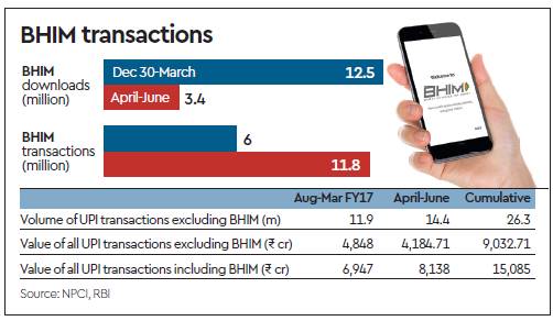 The volume of transactions made using the Bharat Interface for Money (BHIM) app nearly doubled during the first quarter of FY18 from the previous quarter, even as the number of fresh downloads of the app slipped to a fourth sequentially, according to National Payments Corporation of India. The number of transactions on BHIM rose to 11.8 million during the quarter ended June from the aggregate 6.2 million clocked between December 31 – the day the app was launched – and March 30. During the same period, fresh downloads slipped to 3.4 million from 12.5 million as the app found a certain critical mass of users. Data available on the NPCI’s website suggest that payments on the Unified Payments Interface (UPI) channel are seeing a shift in favour of the BHIM app. While the overall value of UPI transactions rose to Rs 8,073.27 crore in the June quarter from Rs 6,843.18 crore during the August-March period, the value of transactions made on UPI platforms other than BHIM dropped to Rs 4,278.35 crore in the first quarter of the current fiscal from Rs 4,848 crore in the quarter ended March.