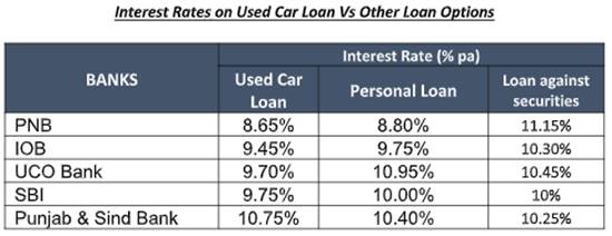 As you can analyse from the table, interest on a used car loan is comparatively cheaper than the personal loan and loan against securities for selected entities. Please note, above-mentioned alternatives don’t require you to hypothecate the car papers with the bank so that it can save you some money towards hypothecation charges.