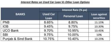 As you can analyse from the table, interest on a used car loan is comparatively cheaper than the personal loan and loan against securities for selected entities. Please note, above-mentioned alternatives don’t require you to hypothecate the car papers with the bank so that it can save you some money towards hypothecation charges.