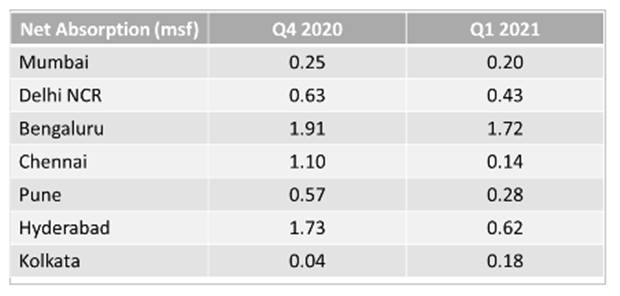 - Net absorption in Q1 2021 stood at 3.6 msf, lower by 42.5% on a quarterly basis.