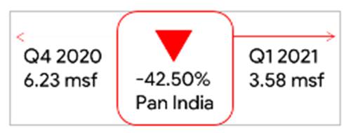 - New completions in Q1 2021 were recorded at 10.9 msf; Hyderabad led with a 38% share. However, supply recorded a 14.0% decline on a quarterly basis due to the resurgence of COVID-19 during the latter part of the quarter.