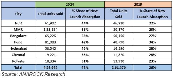 Latest ANAROCK data shows that over 42% of approx. 4.60 lakh homes sold in 2024 was in newly-launched projects – significantly up from pre-pandemic 2019’s sales share of 26% of approx. 2.61 lakh homes sold then.