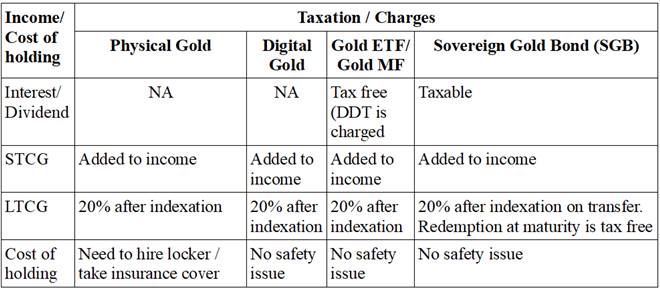 The following table shows comparative taxation on income as well as cost of holding of gold under various investment options: