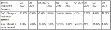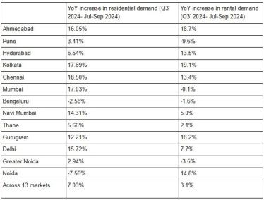 According to Magicbricks, across 13 metros, residential demand (searches) increased 7% YoY between July and September 2024, compared to a 3.1% YoY growth in rental demand (searches).