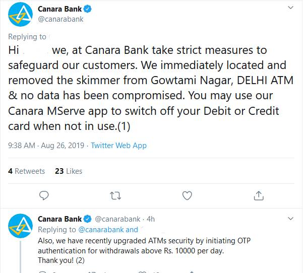 In this case, the ATM belongs to Canara Bank and the bank in a twitter reply to one of its follower has stated, “We, at Canara Bank take strict measures to safeguard our customers. We immediately located and removed the skimmer from Gowtami Nagar, Delhi ATM.” The bank has further informed through the same tweet that no data has been compromised.
