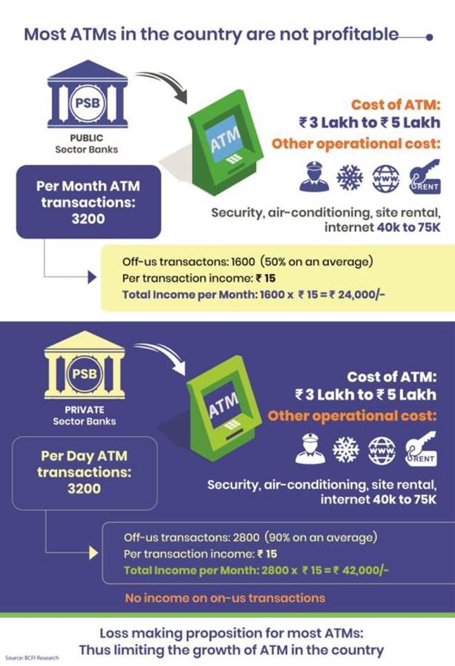 Clearly only select locations in Urban/Semi-Urban areas will far exceed this average ATM transaction value, which will make ATM a viable proposition. Rest all location ATM deployment is loss making for banks and is one of the main reasons for ATM population not growing beyond 210,000+ odd number for quite some time. Large banks business model, therefore, does not rest of ATM cost economics, but overall banking with customers preferring to keep their savings/current account with banks who have better ATM access.