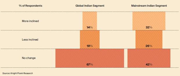 Sharing details on the spending propensity to buy a new home, the report cited that 38% respondents from the Mainstream Indian segment indicated an increase in budgetary allocation towards residential purchase. More than half of the Global Indian segment respondents indicated no change.