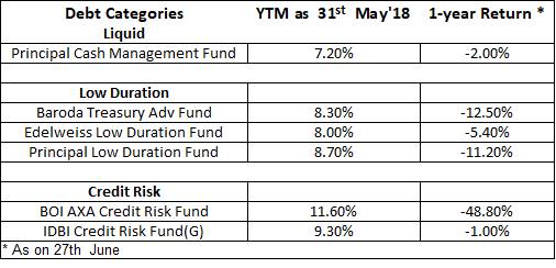 Above table is a select representation of debt schemes across various debt categories. As evident, most of these debt schemes had high YTM as of May 2018. However, one year later as of May’2019, investors who would have invested in these schemes, have even experienced erosion of their principal investments. In nutshell, it is important to understand that shortlisting debt mutual fund basis higher YTM vis-à-vis peers may not necessarily be the right approach.