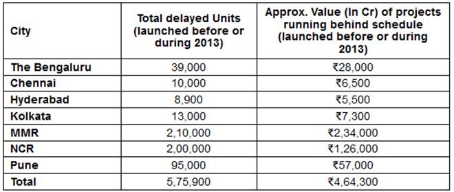 While Greater Noida is worst effected in NCR with about 1,00,000 delayed projects with the valuation of around Rs 43,600 crore, according to ANAROCK data, the picture in other top cities across India are also not very rosy, as about 5,75,900 housing units, costing around Rs 4,64,300 crore, have got delayed.