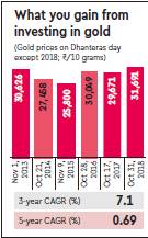So, does it make sense to buy gold this Dhanteras? Chirag Mehta, senior fund manager, Alternative Investments, Quantum Mutual Fund says gold has proved to be a good diversification tool and a store of value for Indian investors. “Even during the recent correction in Indian equities, gold prices in rupee terms have moved up, reiterating its diversification benefits in a portfolio context,” he says. Historical analysis, according to Mehta, proves that gold does add value by reducing risk to Indian equity portfolios. “We therefore recommend a 10% allocation of one’s portfolio. Gold prices have been in consolidation mode over last few years. Given the global macroeconomic backdrop, it does add merit to add gold to your portfolio,” he says.