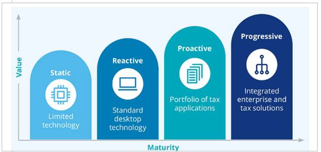 As a start, CFOs are recommended to evaluate the current state of digital maturity index of their tax functions. CFOs can assess where their tax function falls on the maturity curve (from static in which the tax function is a low-return on investment cost center that manages basic compliance and reporting, to progressive, in which the operating model has been transformed and focus shifted to value-added activities such as planning, analytics, and cross-functional collaboration), see figure below, and then determine where they’d like it to be in future.